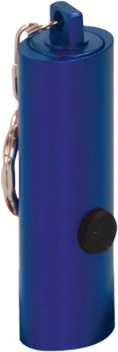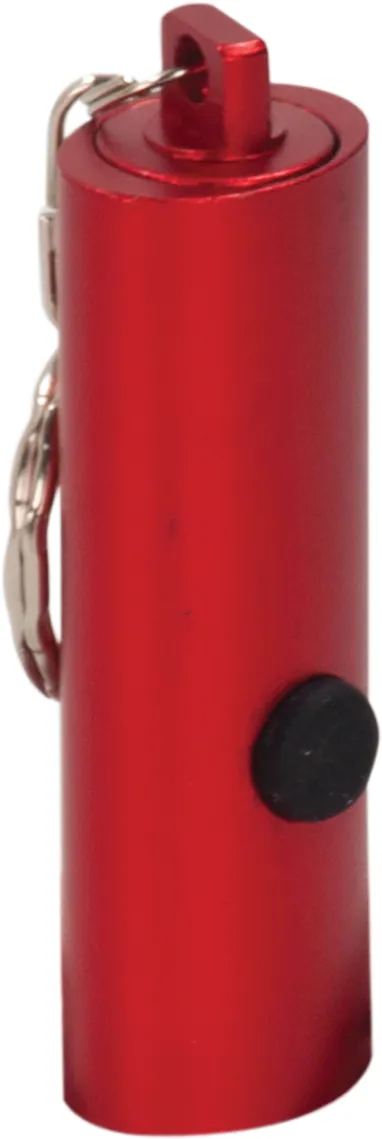 2 3/8 3-LED Laserable Flashlight with Keychain ON/OFF button is on the back end of the flashlight. Access battery by unscrewing the silver portion of the flashlight. Includes one battery, size LR44. Packaged in a white box. Overall Size: 2 3/8"(L) x 5/8" thick