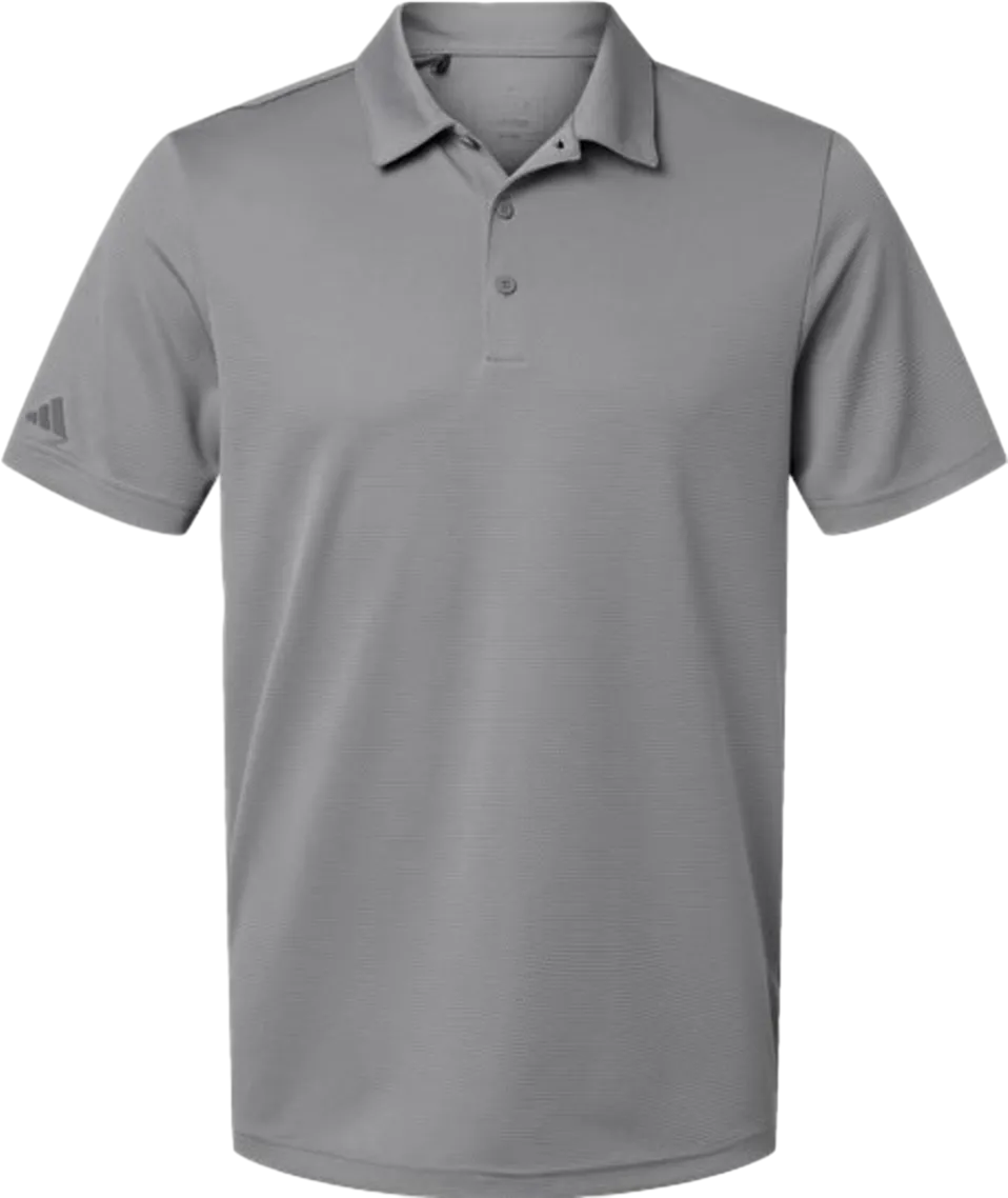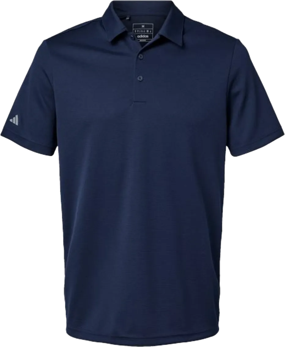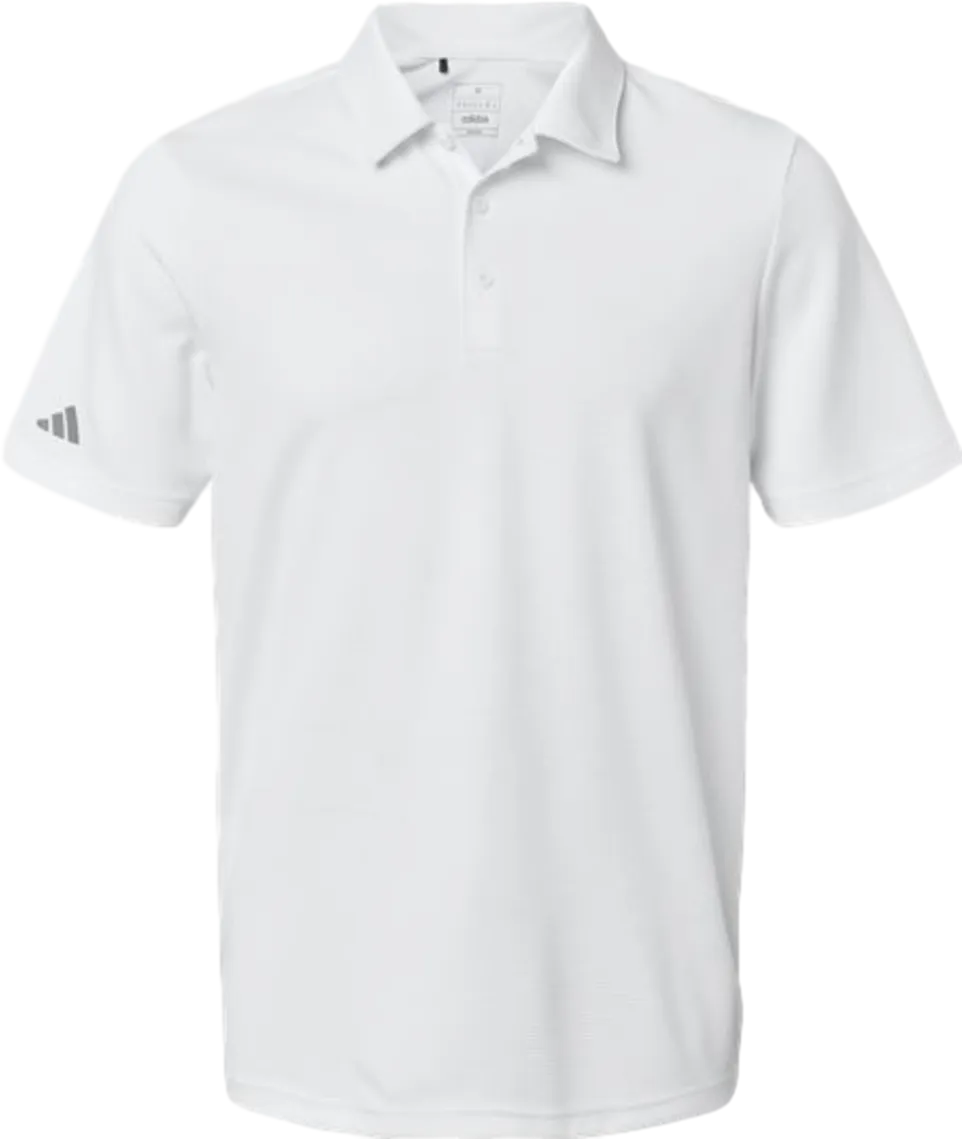 4.7 oz./yd², 100% recycled polyester pique Micro dot texture Self-collar Three-button placket Contrast adidas logo on right sleeve