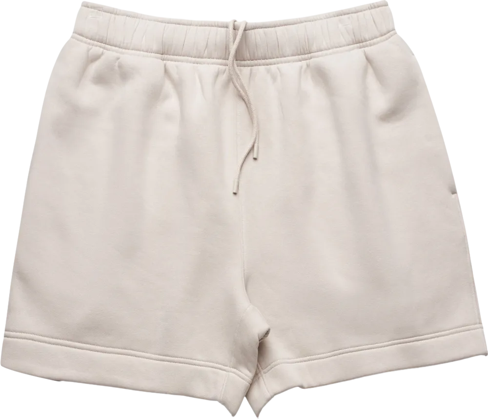 - Sweat shorts, self-fabric elasticated waistband, tonal internal drawcord, 2 side pockets, single pocket at back, double needle hems