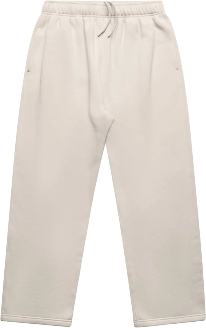 Relax cuffless trackpants in mid-weight 320 GSM fabric with 80% cotton and 20% recycled polyester. Features elastic waistband, tonal drawcord, two side pockets, and one back pocket.
