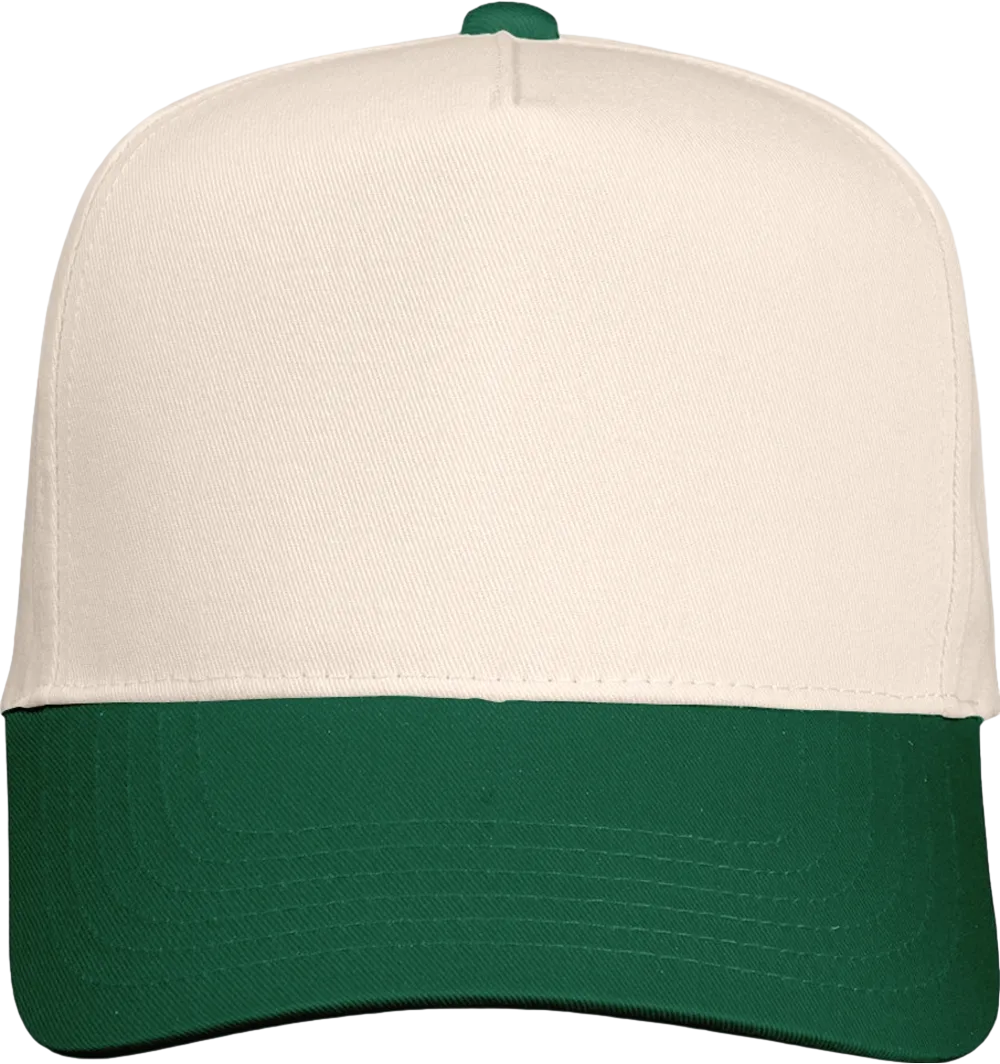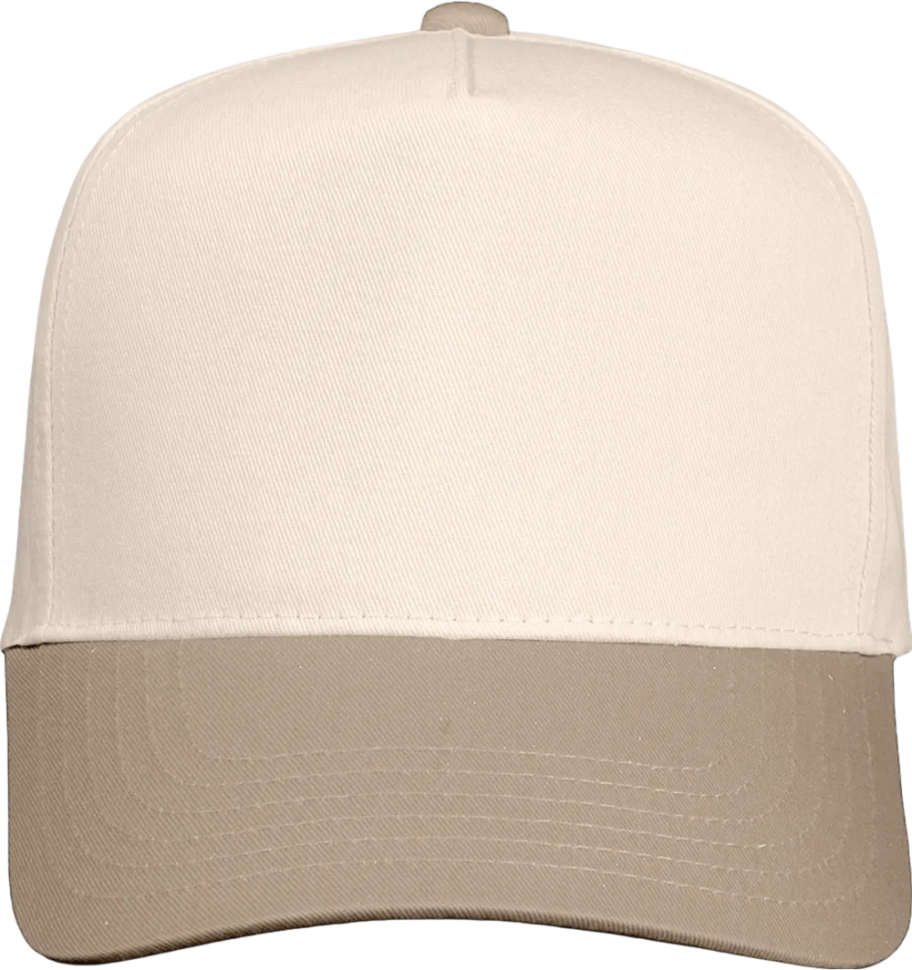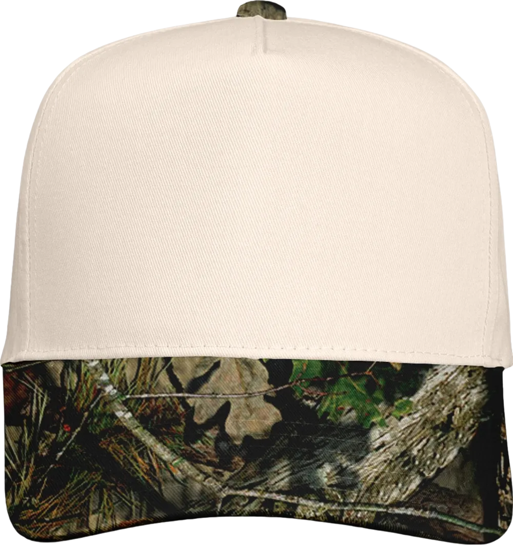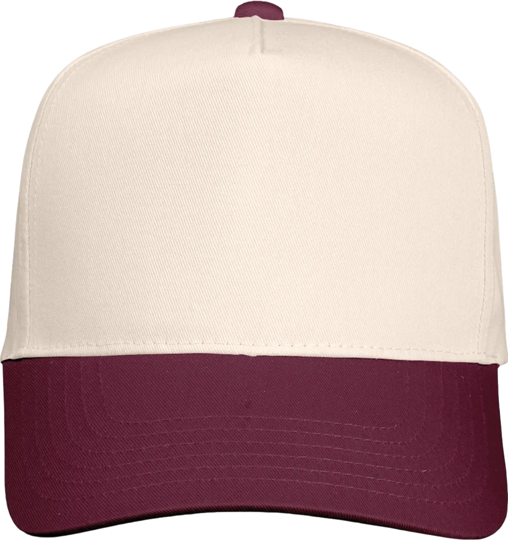 65/35 polyester/cotton twill Structured, five-panel, mid-profile Pre-curved visor Sewn eyelets Snapback closure Tear away label