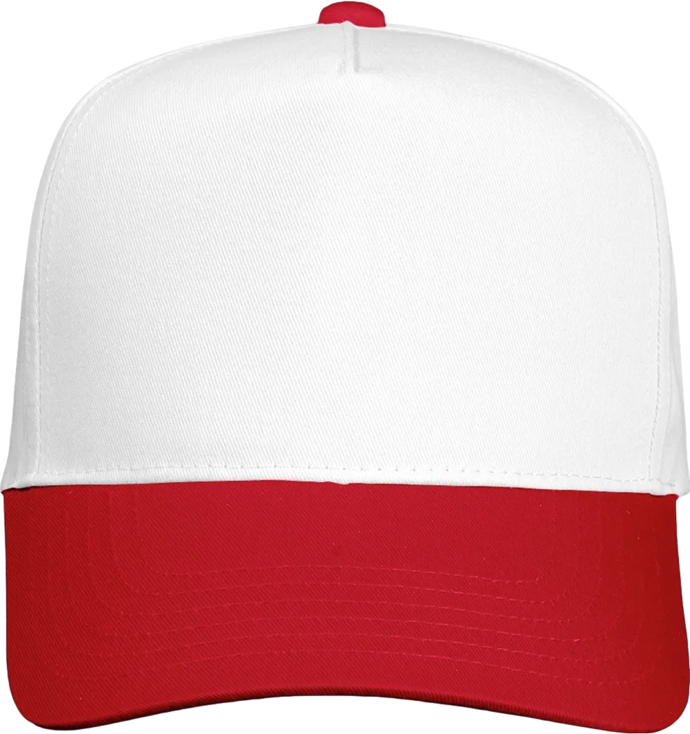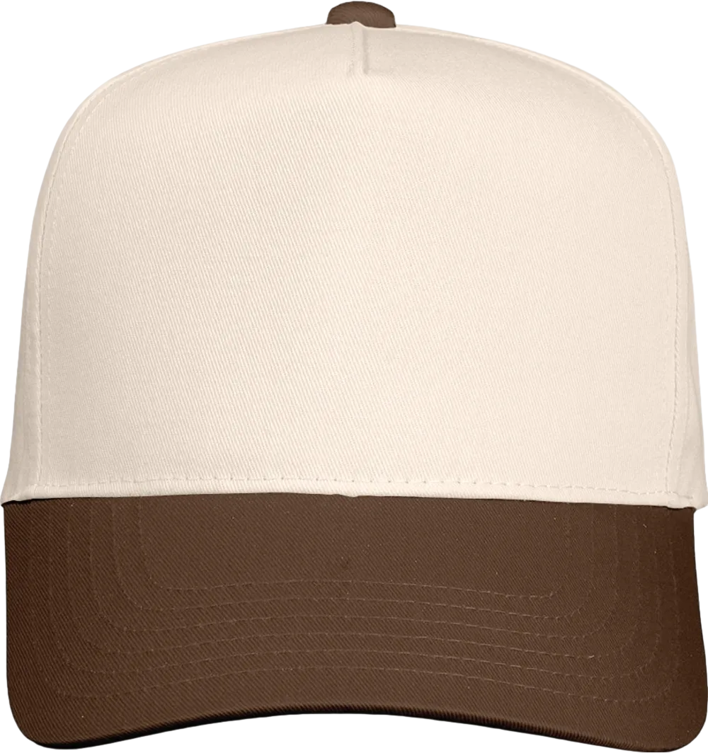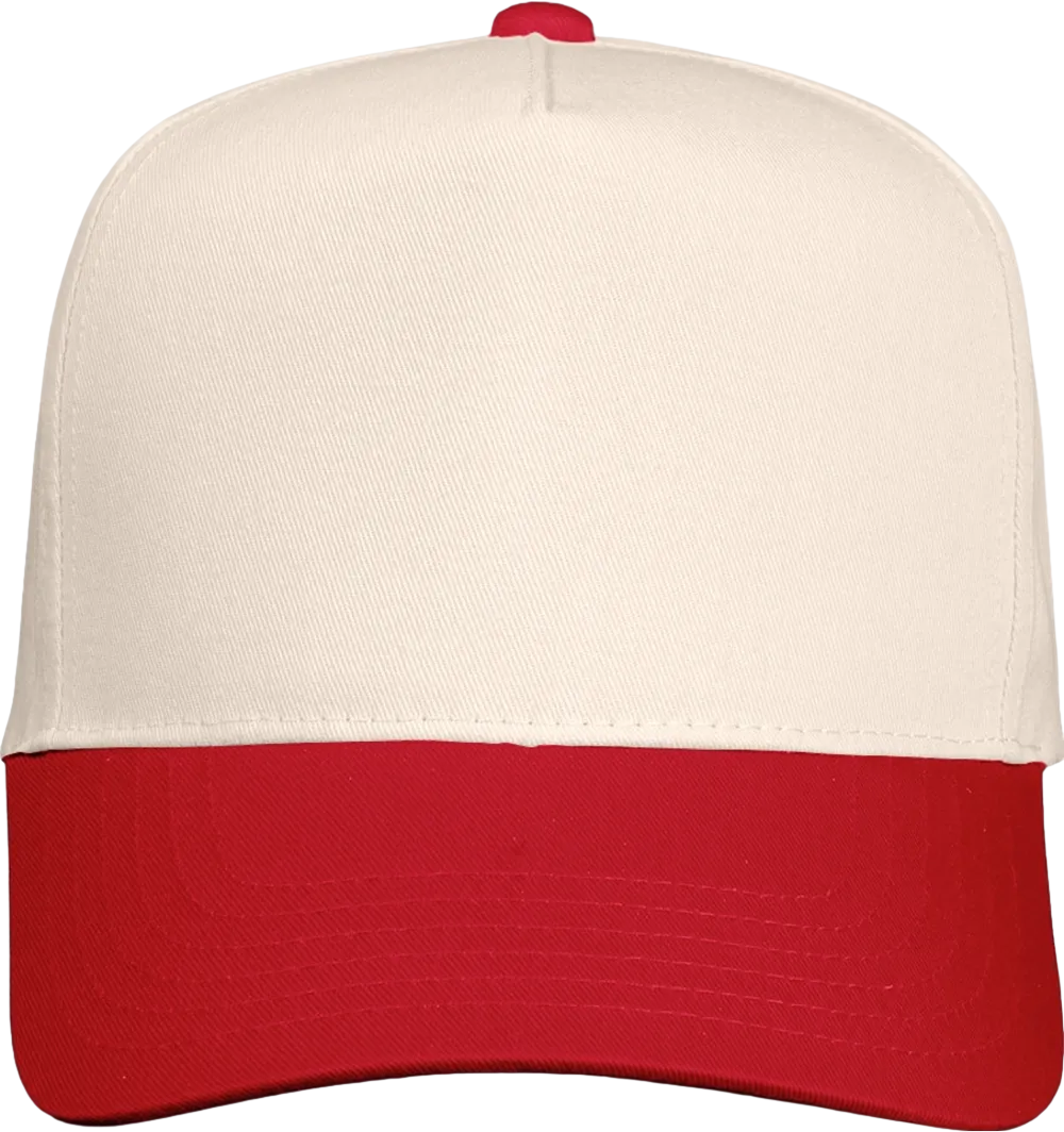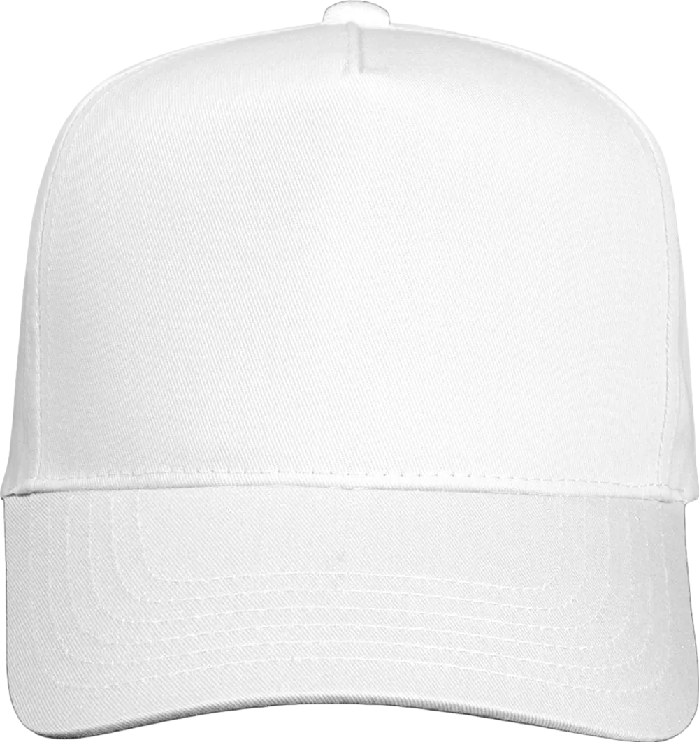 65/35 polyester/cotton twill Structured, five-panel, mid-profile Pre-curved visor Sewn eyelets Snapback closure Tear away label